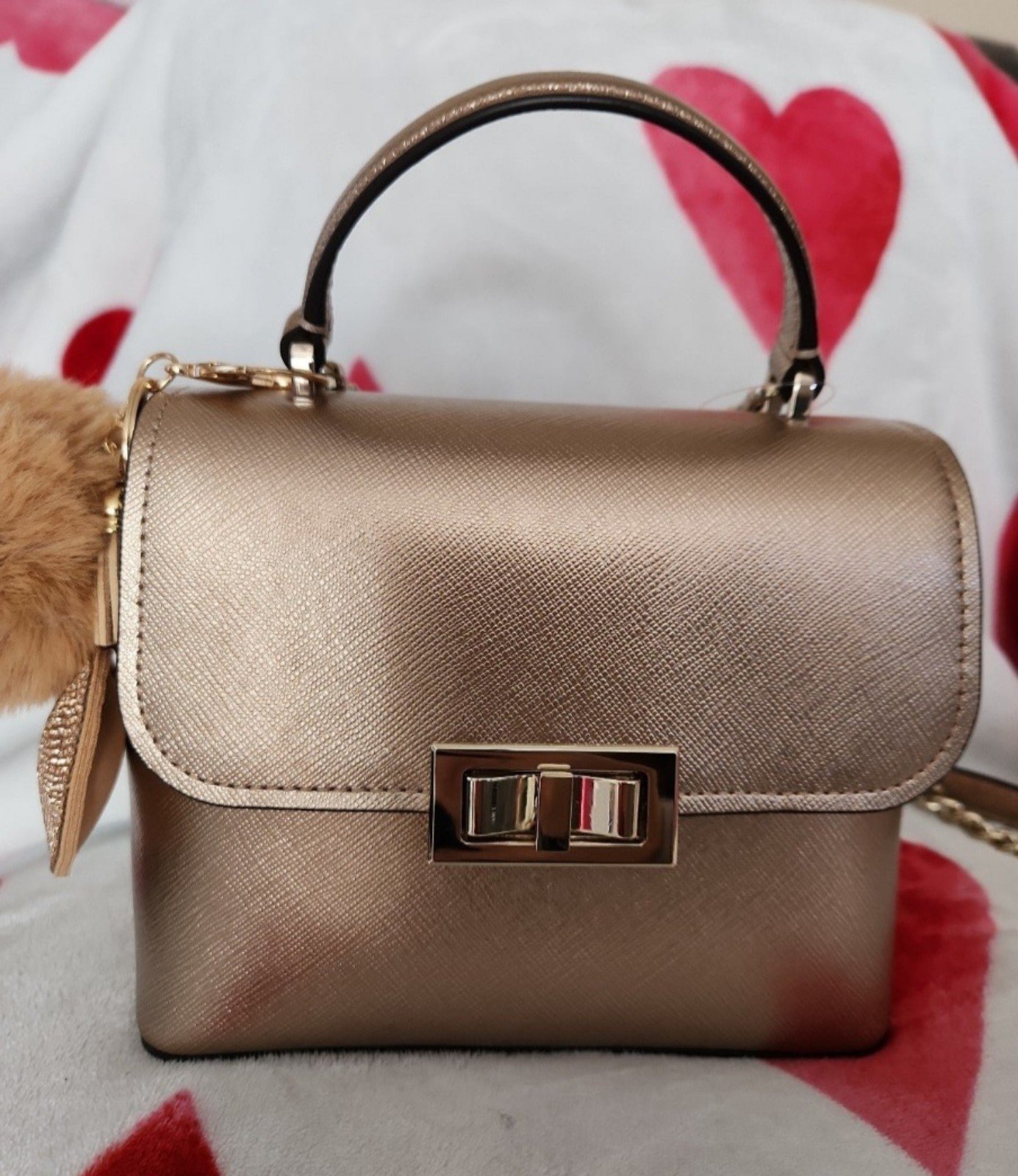 HANDBAG: Beautiful rose gold handbag with bow clasp closure. The bar in the middle of the bow turns to lock and unlock closure. Pretty KS logo on lower back of bag. Slip back pocket, slip inner pocket and 3 CC slots. Detachable shoulder strap included to wear as crossbody. Approximately 7w X 6h X 3.25 deep. FREE Rhinestone Heart Charm.